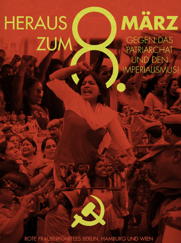 Heraus zum 8. März, dem internationalen Frauenkampftag. In einer Reihe mit den kämpfenden Frauen auf der ganzen Welt rufen wir, die Roten Frauenkomitees Berlin, Hamburg und Wien alle kämpferischen Frauen aus der BRD und Österreich dazu auf, dem revolutionären Kampf der Frauen am 8. März in diesen Ländern einen kraftvollen und lebendigen Ausdruck zu verleihen. Entgegen den heuchlerischen Lügen der Herrschenden von der „gleichgestellten Frau“, müssen wir zeigen dass wir längst aufgehört haben diese Lügen zu schlucken, dass wir die in Wahrheit herrschende Unterdrückung und besondere Ausbeutung der Frauen nicht länger hinnehmen wollen und gemeinsam rufen: Die unterdrückten und ausgebeuteten Frauen kämpfen mit aller Kraft um die Beseitigung der alten Ordnung, um die politische Macht – die Diktatur des Proletariats!
