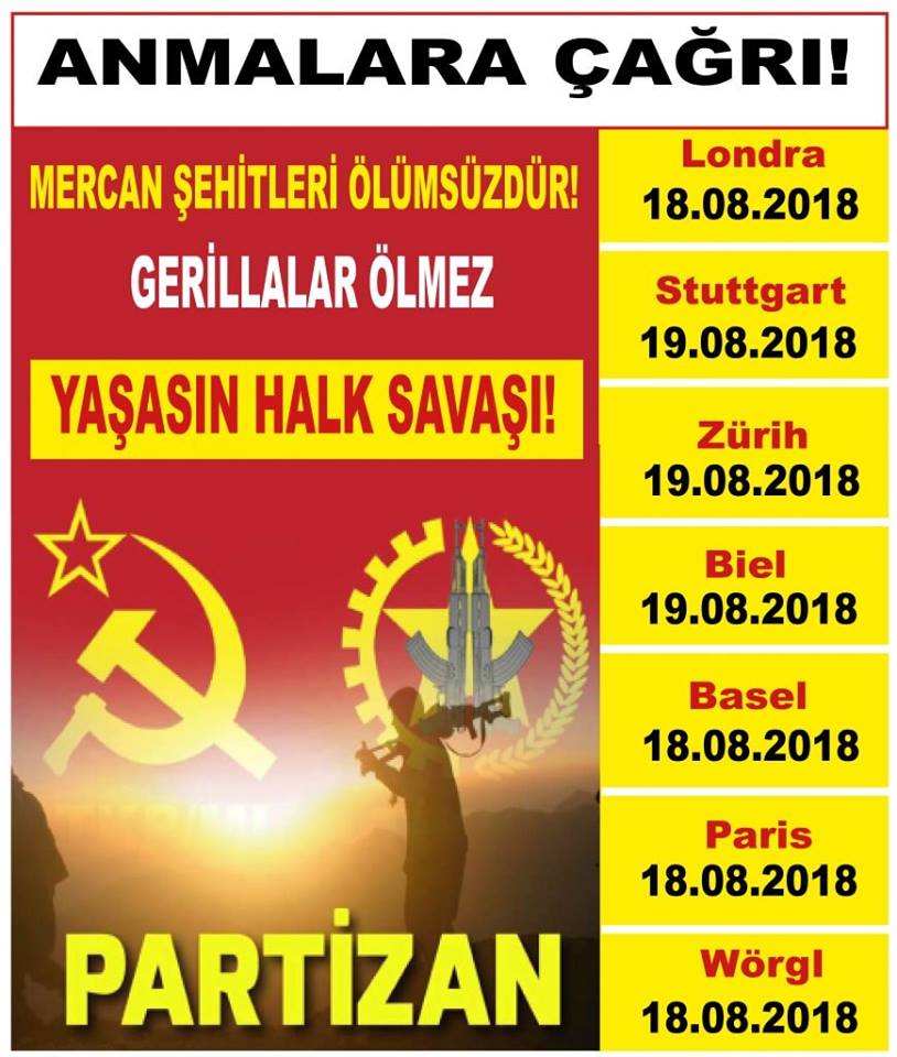 Inzwischen rufen die Genossen von Partizan zu Gedenkveranstaltungen hier in Europa auf, die am kommenden Wochenende stattfinden werden. In London, Stuttgart, Zürich, Biel, Basel, Paris und Wörgl werden am kommenden Wochenende sechs Veranstaltungen stattfinden. Die Genossen von Yeni Demokrasi (Zeitung “Neue Demokratie”) zollen ihren Respekt gegenüber den gefallen Kombattanten, bereits in dem sie das Cover ihrer aktuellen Ausgabe den sechs Kämpfern widmeten. Andere Genossen haben mehrere Graffiti gemalt um den gefallen Genossen zu gedenken.