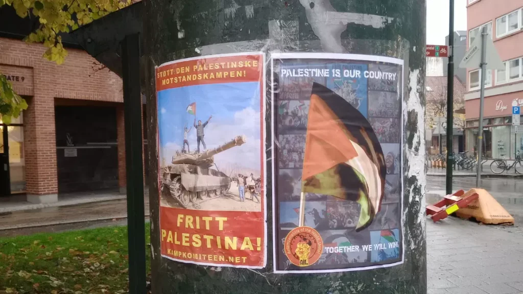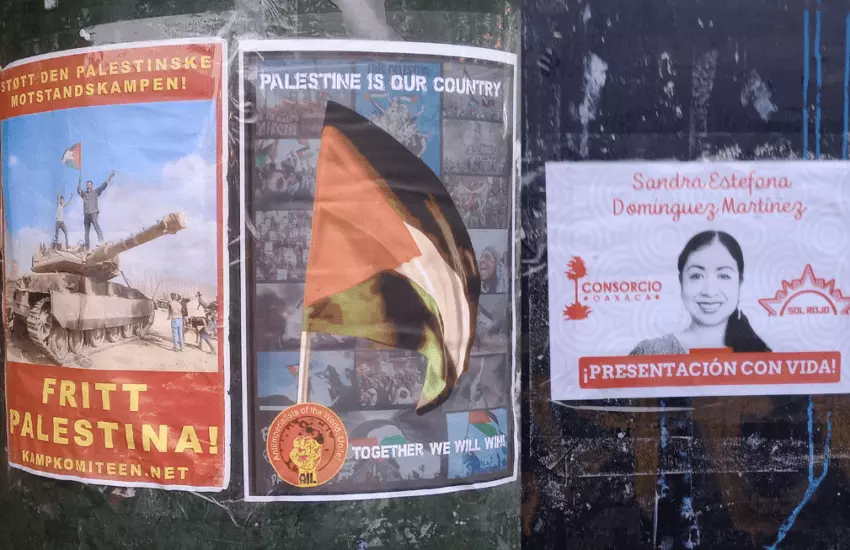 Im norwegischen Kristiansand wurden Plakate für Palästina aufgehängt. Auf einem der Plakate steht „Unterstützt den palästinensischen Widerstandskampf – Befreit Palästina“ und auf dem anderen, das vom Koordinierungskomitee der Antiimperialistischen Liga (AIL) stammt, steht „Palästina ist unser Land – Gemeinsam werden wir siegen“. Außerdem wurden Plakate von Sandra Estéfana Domínguez Martínez gefunden, Anwältin und Schwester eines Mitglieds von Sol Rojo, die am 4. Oktober verschwundenen gelassen wurde.