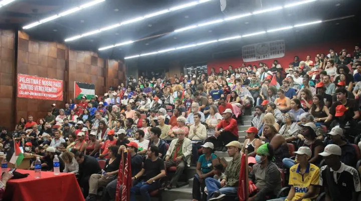 Erfolgreiche Veranstaltung gegen den Völkermord in Gaza und die zionistische Intervention auf brasilianischem Territorium in Rio de Janeiro: Mehr als 400 Menschen, darunter Bauern, Arbeiter, Aktivisten, Lehrer und Organisationen, darunter das Komitee zur Gründung der Anti-Imperialistischen Liga, versammelten sich am 27. Mai an der Universität von Rio de Janeiro unter dem Motto „Kein Schritt zurück: Stoppt die Ausrottung in Gaza und die zionistische Intervention in Brasilien!“