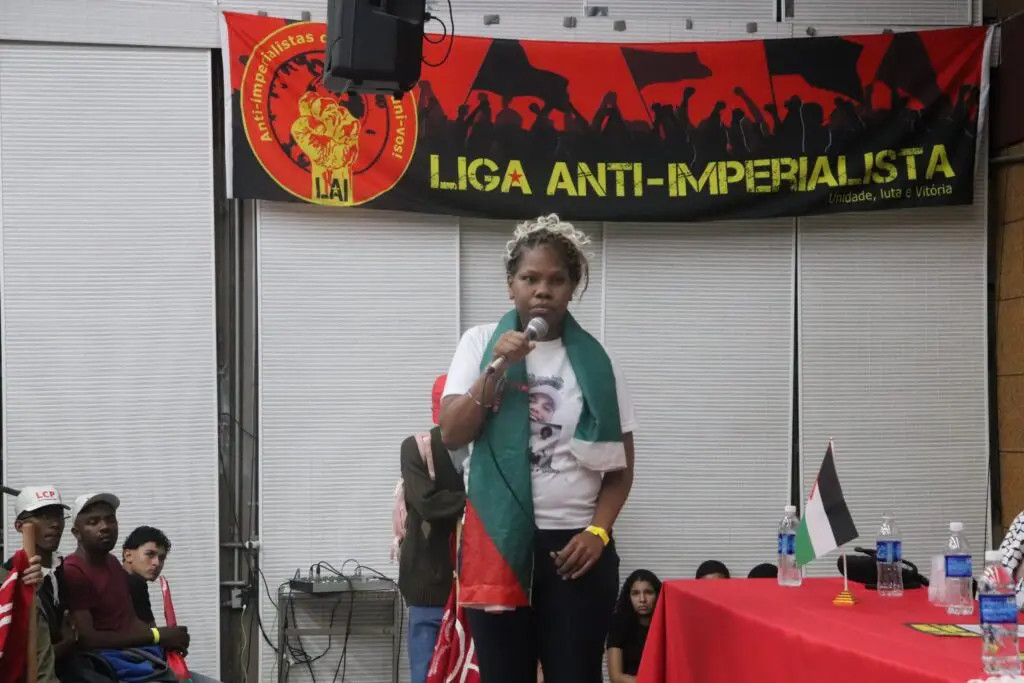 Sonia Bonfim, Vertreterin des Kollektivs der Mütter von Opfern staatlicher Gewalt, denunzierte den Parallelismus des Völkermords in Brasilien. „Der gleiche Krieg, der in Palästina stattfindet, geschieht hier in Rio de Janeiro… Wir gehen jeden Tag unter Beschuss hinaus; wir können unsere Kinder nicht zur Schule schicken“, erklärte sie. Sonia hatte eine Tochter, die von der Militärpolizei (MP) vor der Schule erschossen wurde, und verlor ihren Sohn und Ehemann durch die Hände derselben MP. „Wir nutzen den Widerstand gegen die Gewalt, und wir werden bis zum Ende Widerstand leisten“, bekräftigte sie.