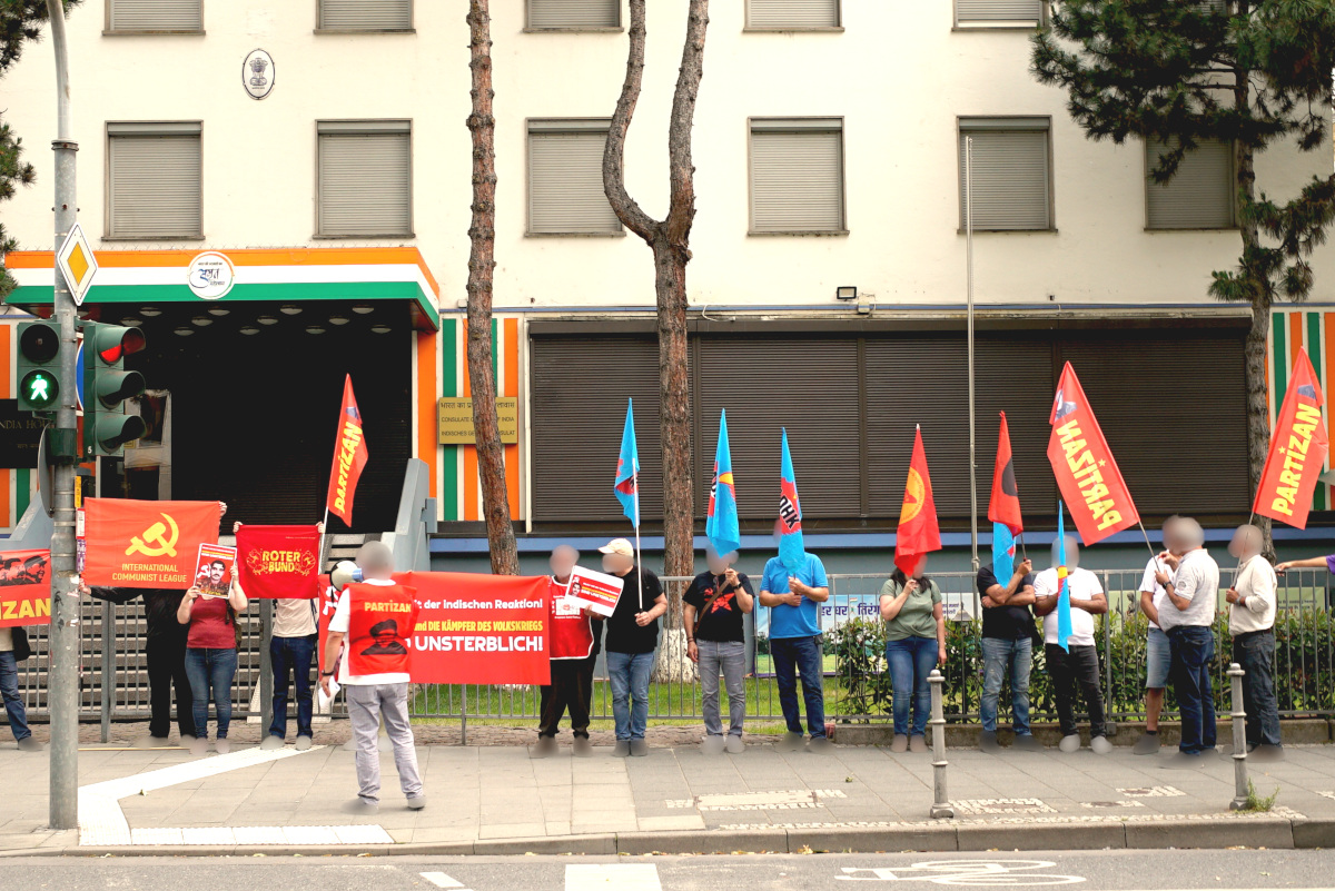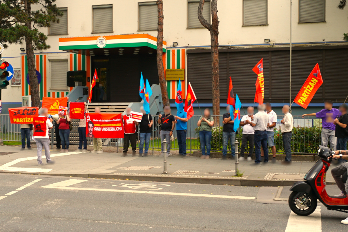 Parallel zum Festival beteiligten sich Aktivisten des Roten Bundes gemeinsam mit Genossen und Freunden von Partizan, Sinif Teorisi, TSP und Bir-Kar an einer spontanen und unangemeldeten Protestaktion gegen die Ermordung des Generalsekretärs, Genosse Basavaraj, und den anderen 27 maoistischen Kämpfern vor dem indischen Generalkonsulat in Frankfurt. Mit Redebeiträgen und Parolen auf türkisch und deutsch wurde den ermordeten Genossen gedacht und gleichzeitig die weitere Unterstützung und Solidarität für den Sieg der neudemokratischen Revolution und des Volkskrieges in Indien ausgesprochen. Die von Bediensteten des indischenKonsulats informierte Polizei kam zu spät und machte keinerlei Anstalten gegen die Revolutionäre vorzugehen.