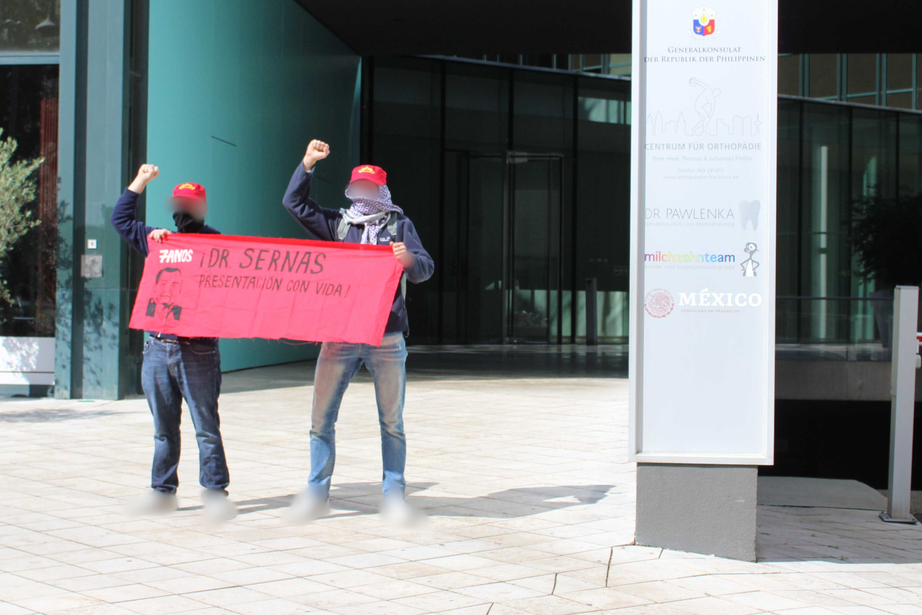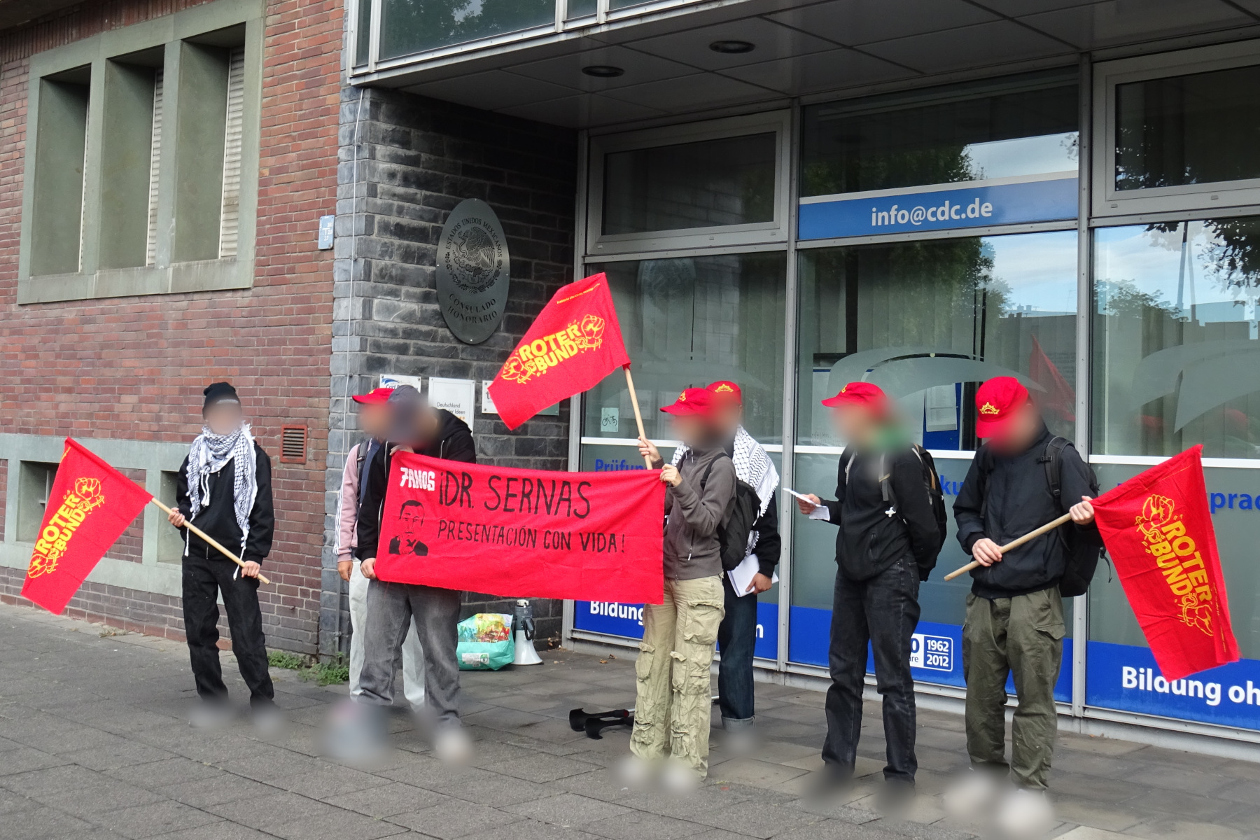 Vor dem mexikanischen Honorarkonsulat in Köln wurde eine Kundgebung gehalten, sowie auch vor dem mexikanischen Konsulat in Frankfurt. In Köln beteiligten sich die Aktivisten des Roten Bundes anschließend an der „Rheinmetall Entwaffnen“-Demonstration und währenddessen war ein Kontingent in Frankfurt auf einer Palästina-Demonstration. Das Wochenende fand seinen Abschluss mit dem monatlichen Vortrag in Köln. In all diesen Aktionen, egal ob auf Bannern, Flugblättern oder Schildern, hieß es: „#DrSernasPresentaciónConVida“