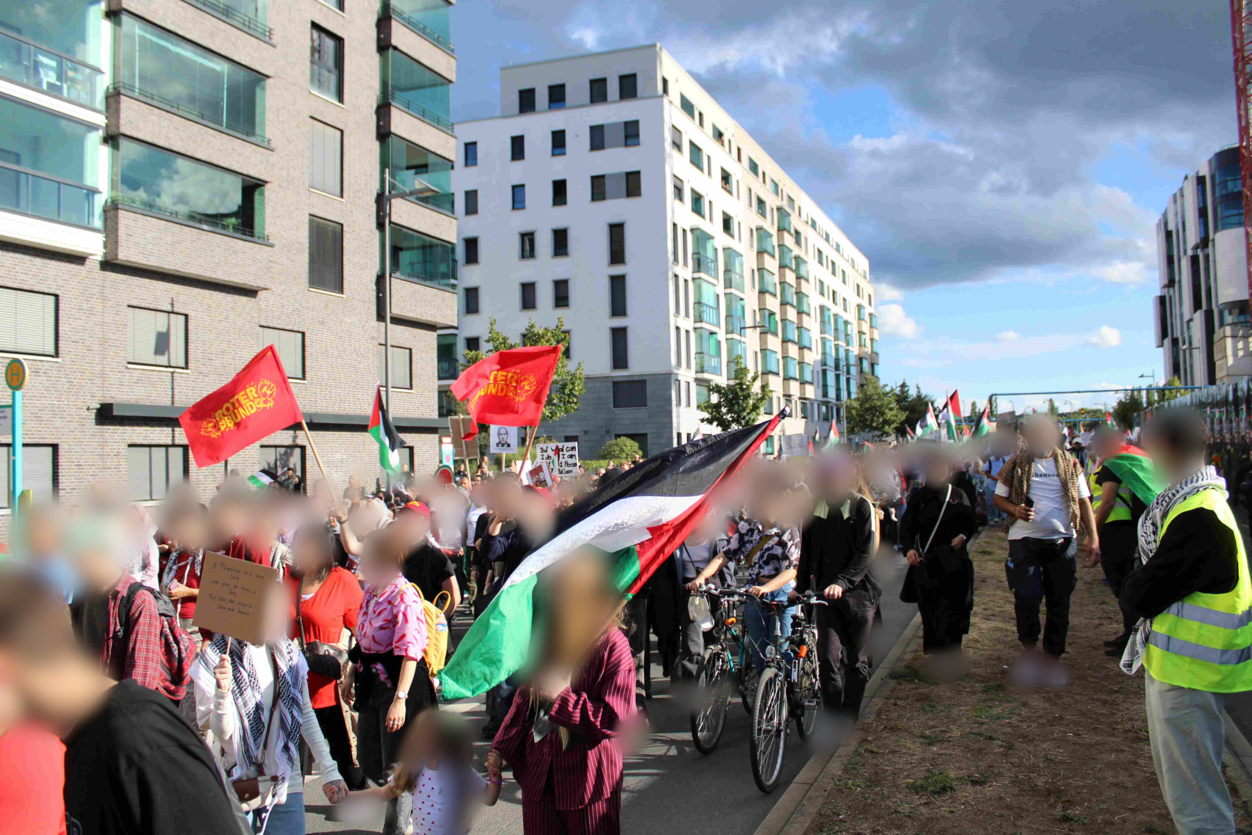 Währenddessen führten Aktivisten des Roten Bundes auch eine Aktion in Frankfurt vor dem mexikanischem Konsulat durch. Mit einem Banner, dass die lebendige Präsentation des Genossen Dr. Sernas forderte setzten die Aktivisten auch dort ein Zeichen: Die Verschwundenen sind nicht vergessen, für sie wird gekämpft und am 30. August geht dieser Kampf international auf die Straße. Im Anschluss beteiligten sich die Aktivisten an einer Demonstration gegen den Genozid in Palästina. Um die 15.000 Menschen zogen gemeinsam bis zur Hauptwache und zeigten klar und deutlich, dass die Massen auch hier in Deutschland an der Seite des Palästinensischen Widerstandes stehen.