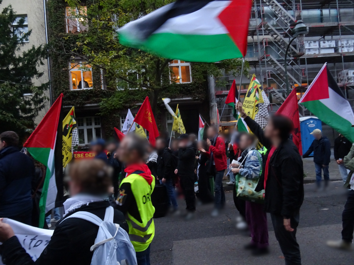 Für den 25. Oktober war in Düsseldorf erneut eine Demonstration angekündigt, die – anders als Demonstrationen in Düsseldorf der letzten Monate – unter deutlich kämpferischeren Slogans mobilisierte und nicht hauptsächlich von sich mit der „Palästinensischen Autonomiebehörde“ solidarisierenden Kräften organisiert wurde. Die Polizei gab in letzter Sekunde einen so umfassenden Auflagenbescheid für die Demonstration heraus, dass die Organisatoren sich dagegen entschieden, die Demo durchzuführen. Kurzfristig wurde eine Spontankundgebung angemeldet und durchgeführt, bei der es trotz strömenden Regens eine durchweg kämpferische Stimmung unter den Demo-Teilnehmern gab.