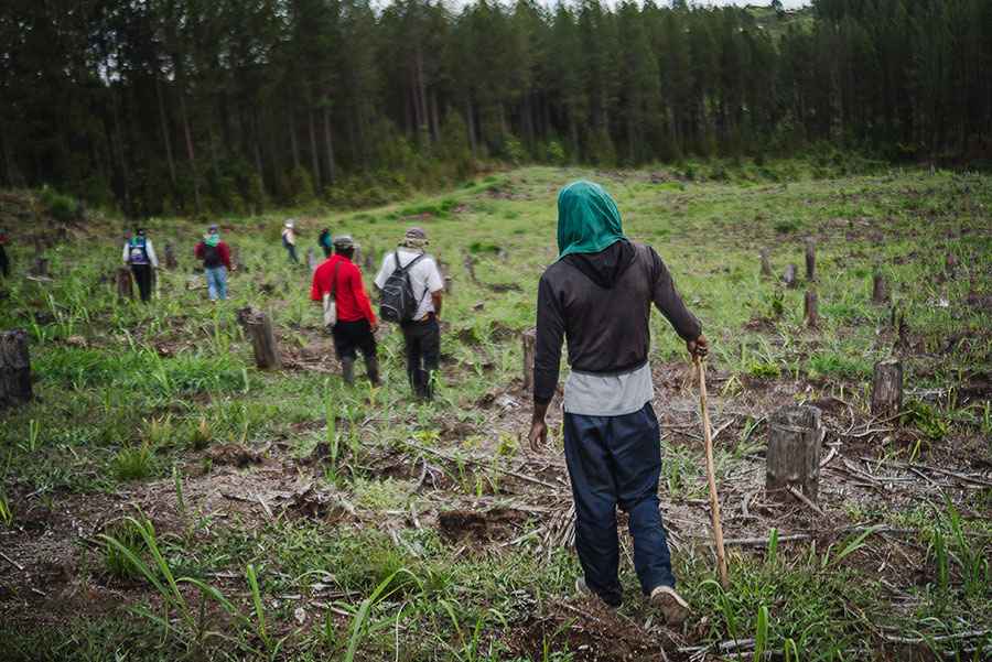 Nun dies ist keine kürzliche Landbesetzung, dies war ein Prozess des Widerstands, der seit fast vier Jahren um Land stritt. Seit dem 27. Juli 2021 kamen etwa 150 Bauern und Indigene, welche von der Nationalen Agrar Koorditation (CNA) zusammengebracht wurden, mit Äxten und Macheten, um sich den Kieferforst des irischen multinationalen Papierkonzerns Smurfit in Cajibío im Cauca wiederzuholen. Smurfit vereinnahmt und beutet mehr als 3.000 Hektar Bodens mit Kiefer Monokultur aus, somit die bäuerliche Wirtschaft und den Rohstoffhandel der Region zu Grunde richtend. Am vergangenen 10. Juli wurde in einer gemeinsamen Operation um die 290 ESMAD (kolumbianische Aufstandsbekämpfungseinheit- Anmerkung des Übersetzers) und 700 Soldaten, Polizisten und Arbeiter des Unternehmens entsendet, um die Bauern vom Grundstück zu vertreiben. Die Landbesetzer haben dafür gekämpft, dass jeder Pflüger sein Feld bekommt, das hat ihnen Drohungen, Vertreibungen und sogar Mord eingebracht. Aber selbst nach diesen Rückschlägen bleiben sie in ihrer Entscheidung fest entschlossen, so wie es ihre Mitteilungii welche am 11 Juli kurz nach ihrer Vertreibung veröffentlicht wurde, es mitteilt.