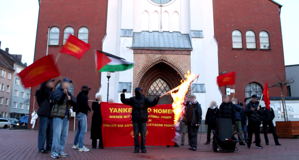 Dass die Aktivisten ihre Worte ernst meinten, untermauerten sie mit dem Abbrennen einer Yankee-Fahne, was von den Menschen auf der Münsterstraße sehr begrüßt wurde. Dies zeigt abermals wie verhasst der Imperialismus im Allgemeinen und besonders der Yankee-Imperialismus unter den tiefsten und breitesten Massen, unter den Ausgebeuteten und Unterdrückten, ist.