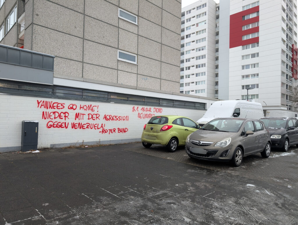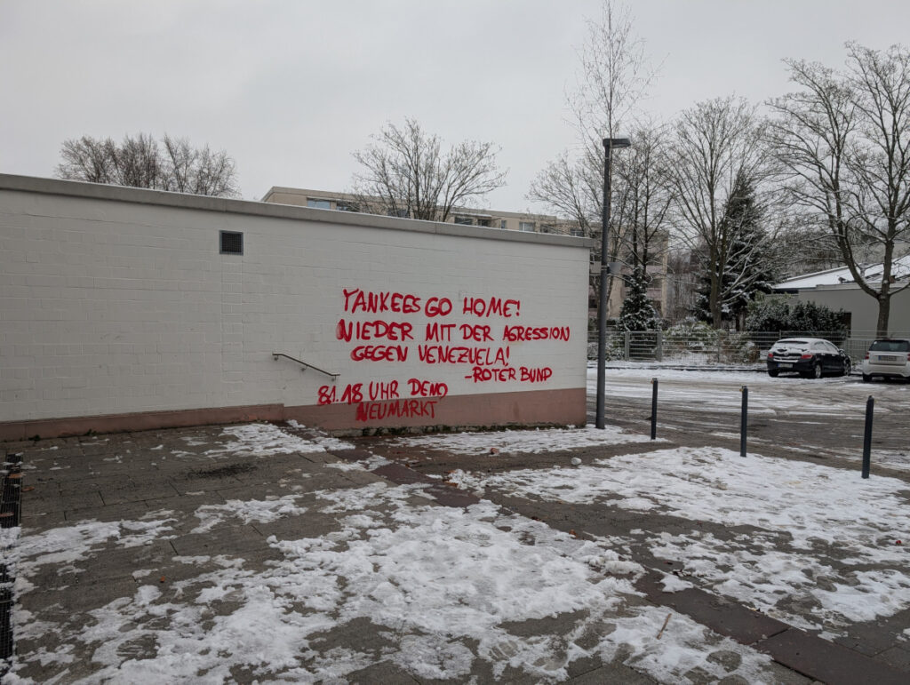 Zu den Parolen „Yankees go home“, „Nieder mit der Aggression gegen Venezuela“ und „Stärkt die Antiimperialistische Front!“ wird mit den Malungen außerdem zu einer Kundgebung aufgerufen, die am Donnerstag den 08.01.26 um 18 Uhr am Neumarkt stattfindet.