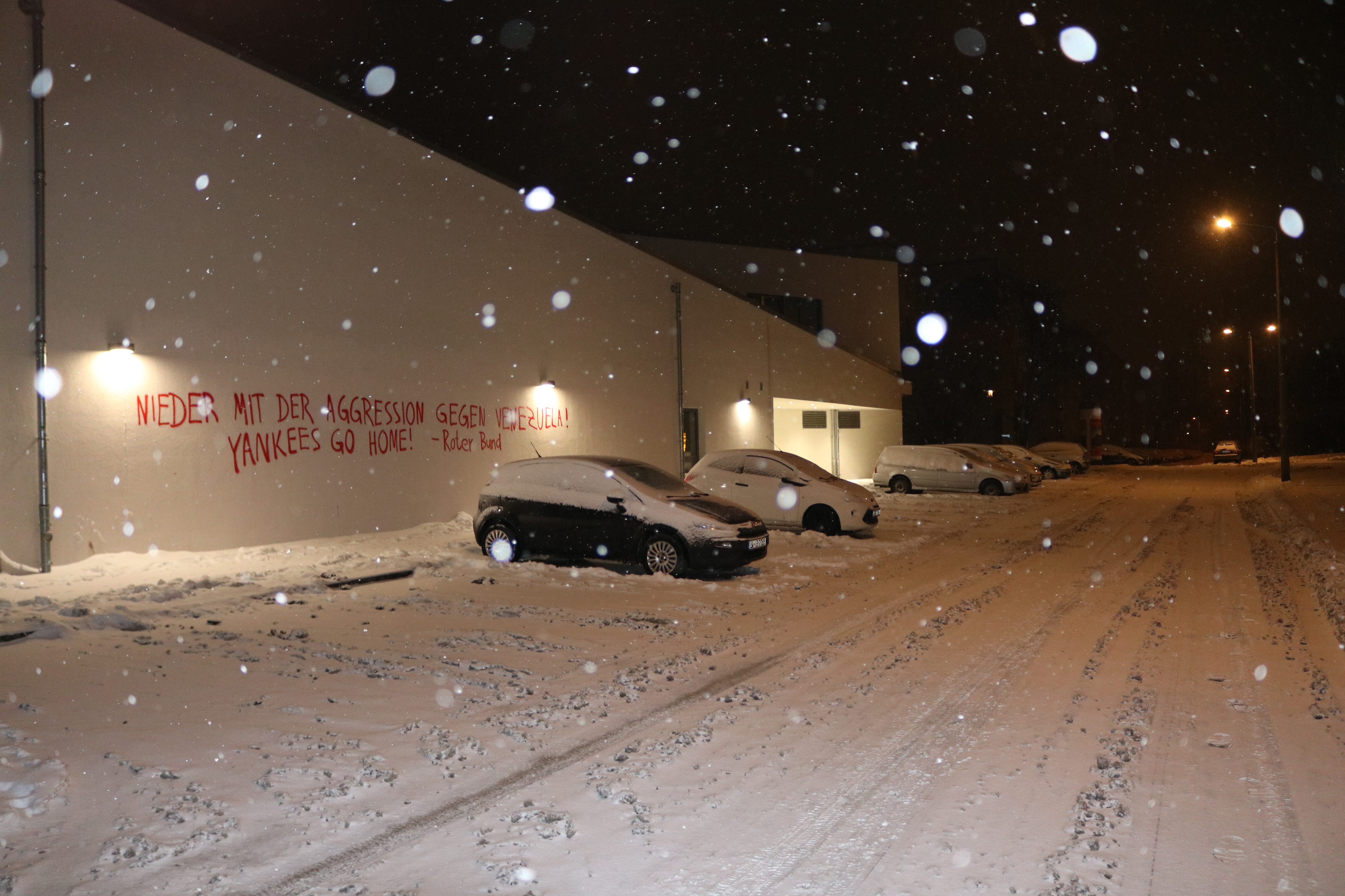Auch in Leipzig wurde eine Aktion anlässlich der Intensivierung der Aggression gegen Venezuela durchgeführt. Vorherige Woche wurde eine Malung gegen den Yankee-Imperialismus in Schönefeld angebracht.