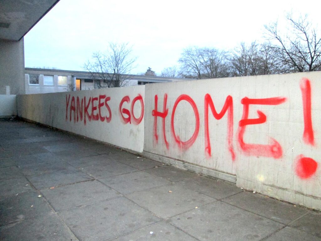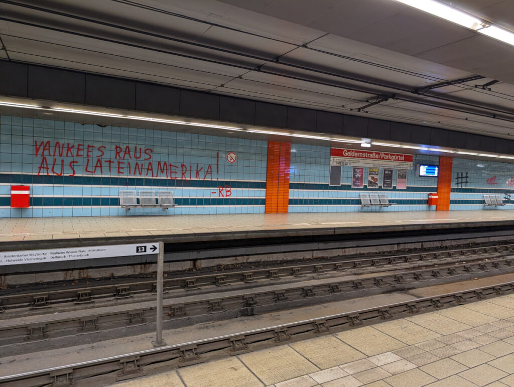 In einer U-Bahn-Station in Köln-Niehl wurde eine Malung mit dem Schriftzug„Yankees raus aus Lateinamerika!“ durchgeführt.