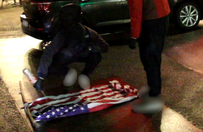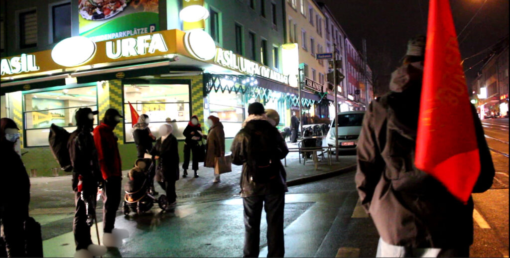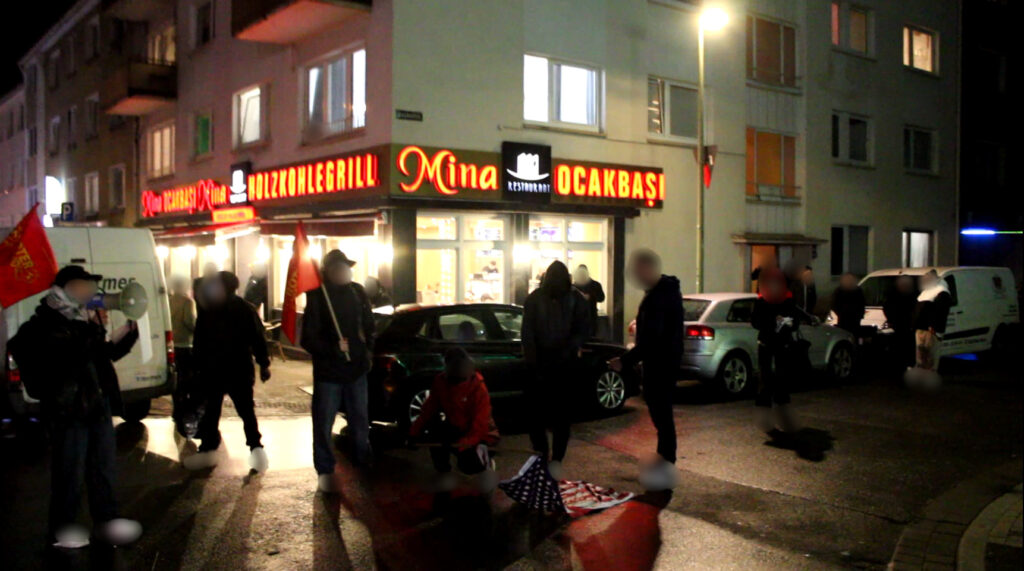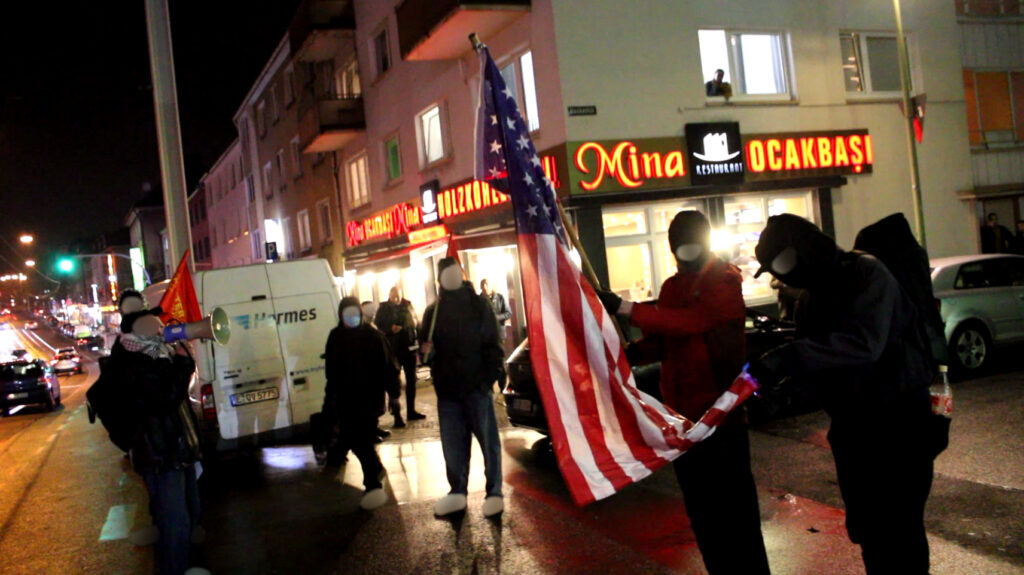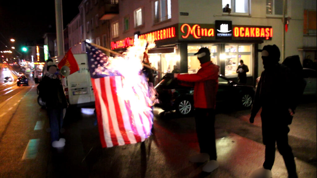 Zum Ende wurde eine Yankee-Fahne verbrannt, was von den Menschen sehr begrüßt wurde. Anwohner öffneten die Fenster ihrer Wohnung, bejubelten dies und riefen „Viva Palästina“. Dies zeigt einmal mehr die gerechtfertigte Wut der Menschen gegen den Yankee-Imperialismus und seine Aggressionen.
