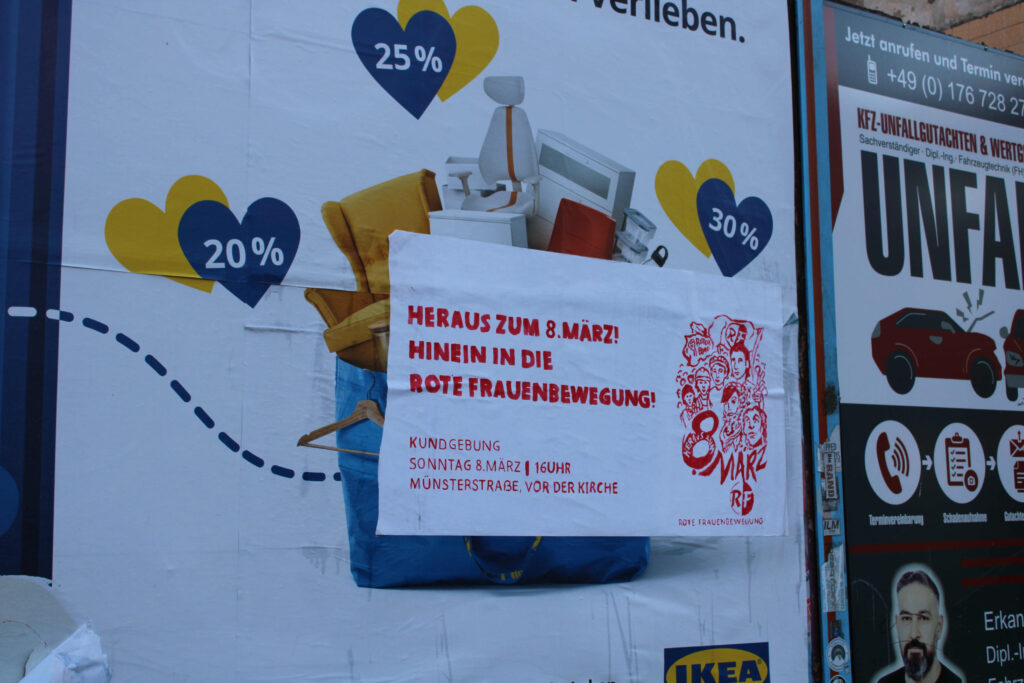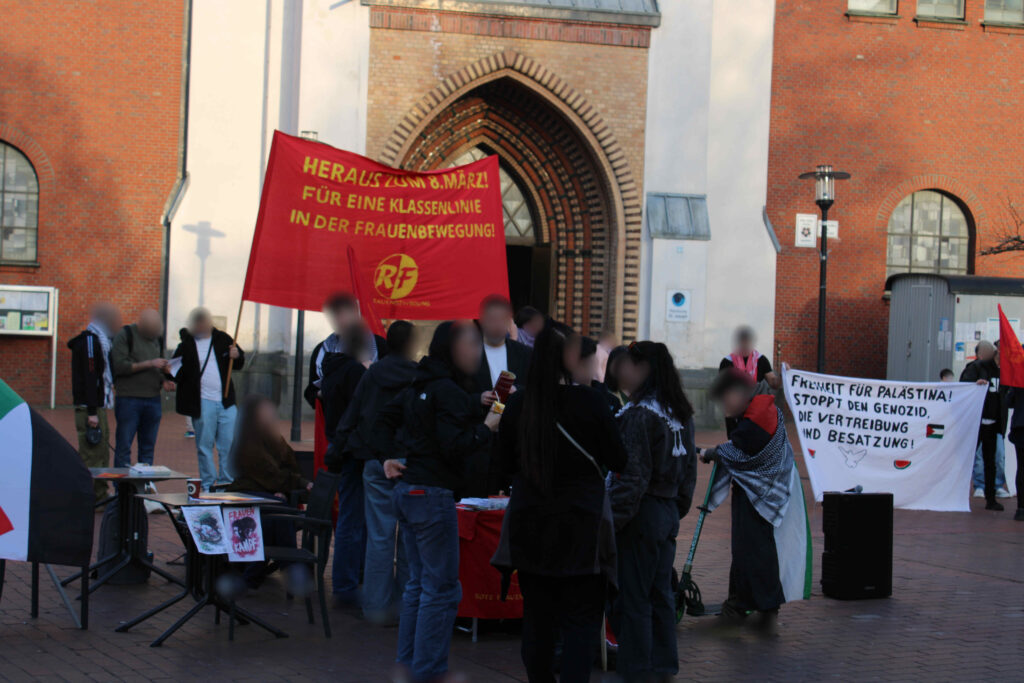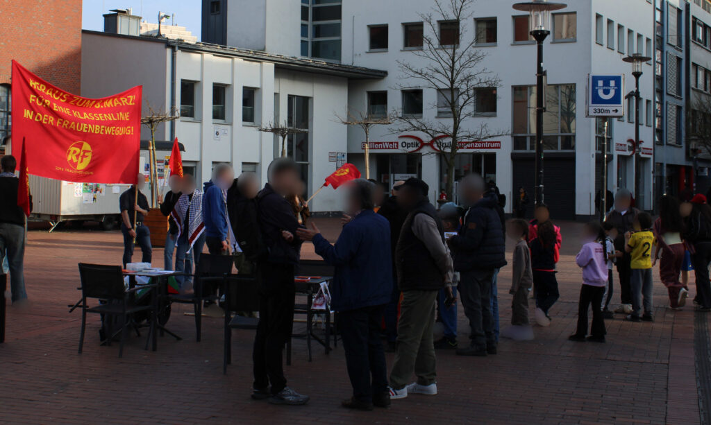 Am Nachmittag fand dann die Kundgebung in der Dortmunder Nordstadt statt. Mit Parolen, einem Infotisch und Musik zogen die Aktivisten die Aufmerksamkeit auf sich. Auch hier wurden erneut Aufrufe zu den Aktivitäten der Roten Frauenbewegung aus Anlass es 8. März verteilt, die Rote Post verkauft und auf der Münsterstaße zahlreiche Gespräche darüber geführt, was die Rote Frauenbewegung ist. In diesem Sinne hielten Aktivistinnen der Roten Frauenbewegung, in denen auf deren Ziele eingegangen wurde, die Klassenlinie in der Frauenbewegung dargelegt wurde und alle revolutionär gesinnten Frauen dazu aufrief sich in der Roten Frauenbewegung zu organisieren. Auch andere Kräfte in Dortmund, wie das Palästina Café, oder Einzelnpersonen hielten auf der Kundgebung Redebeiträge.