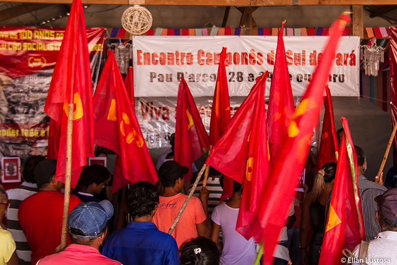The meeting took place in the same place of the historical Peasant Meeting of the South of Pará in October 28 and 29 2017, where peasants from the region, indigenous and quilombola representatives, Brazilian Association of People’s Lawyers (Abrapo) Brazilian Center of Solidarity to the Peoples (Cebraspo) representatives and other regional and national movements to reaffirm in the path of struggle for the land in the region. The Poor Peasants League and the New Victory Association of Jane Júlia Settlement were there to denounce that the old State was not giving anything, that this decision was a result of the struggle and demanded justice against the release of 15 police officers charged of participating in the massacre. Many banners and flags of the League were filling the meeting place, as well as the image of the 11 murdered peasants.