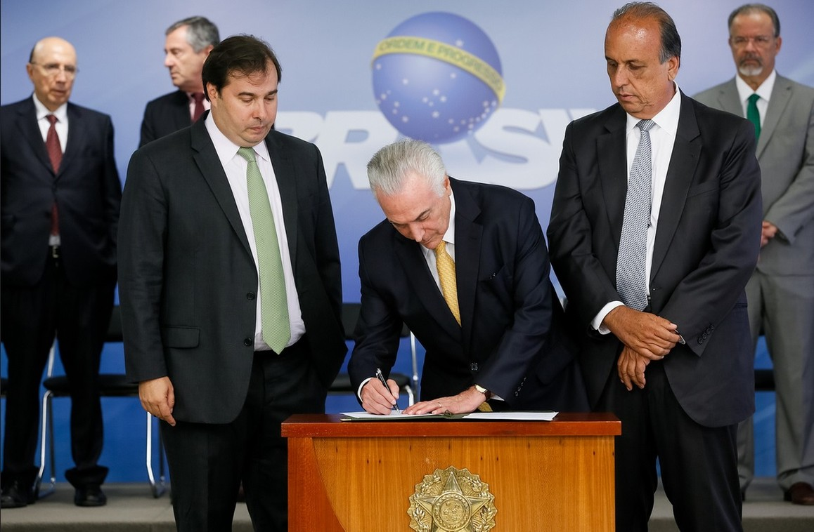 From left to right: Rodrigo Maia, Temer and Pezao signing the military intervention.