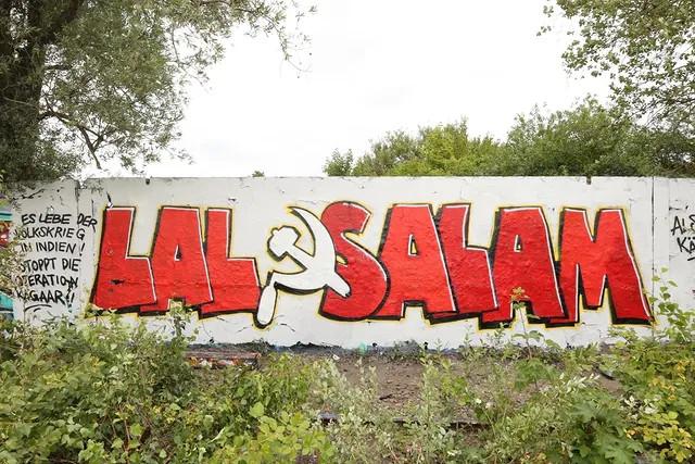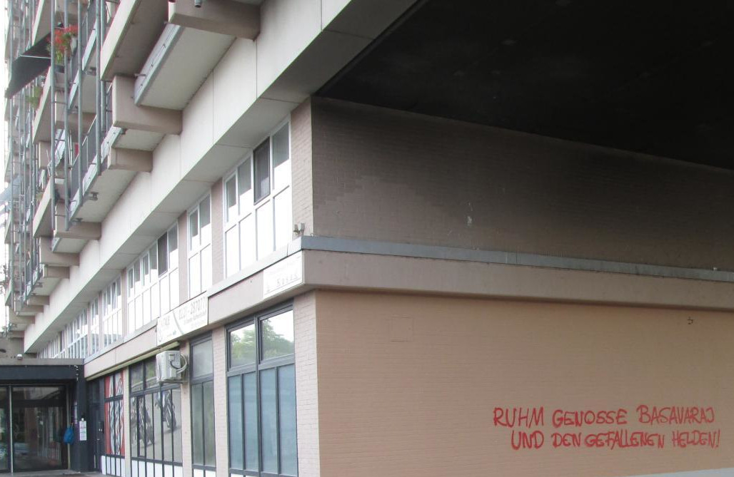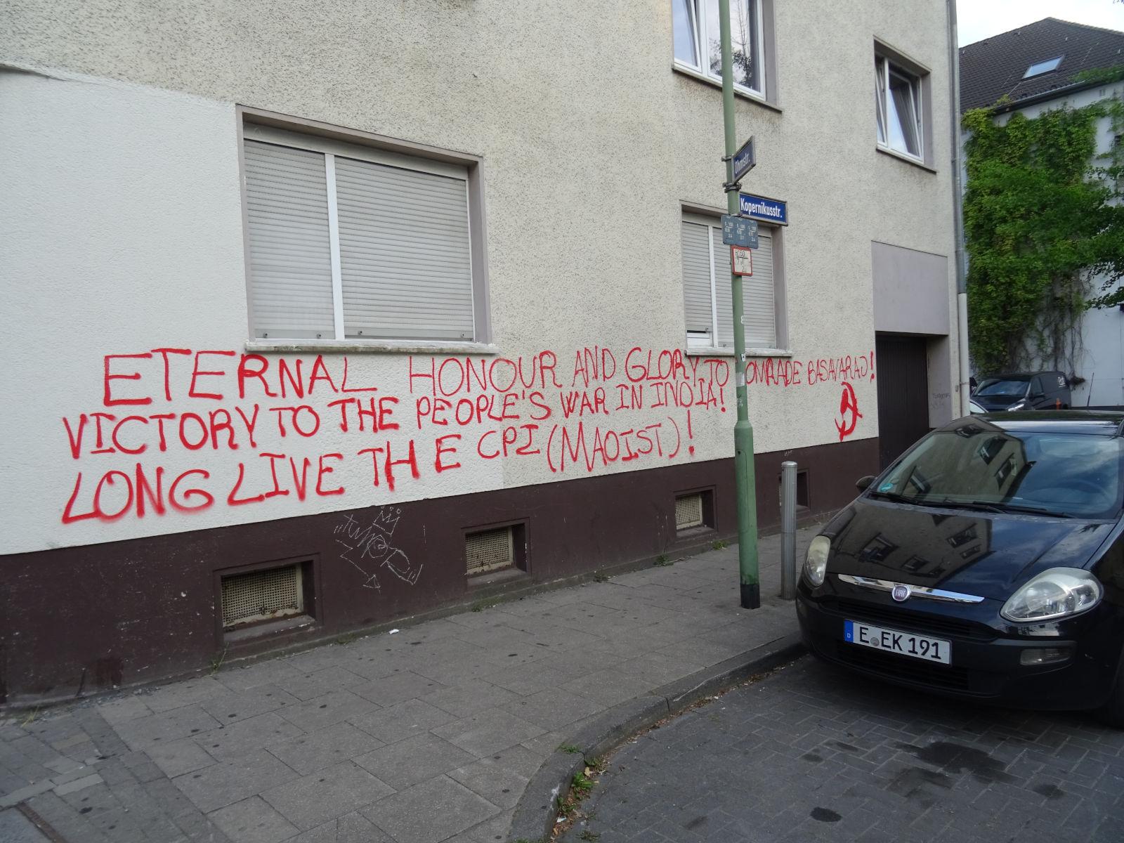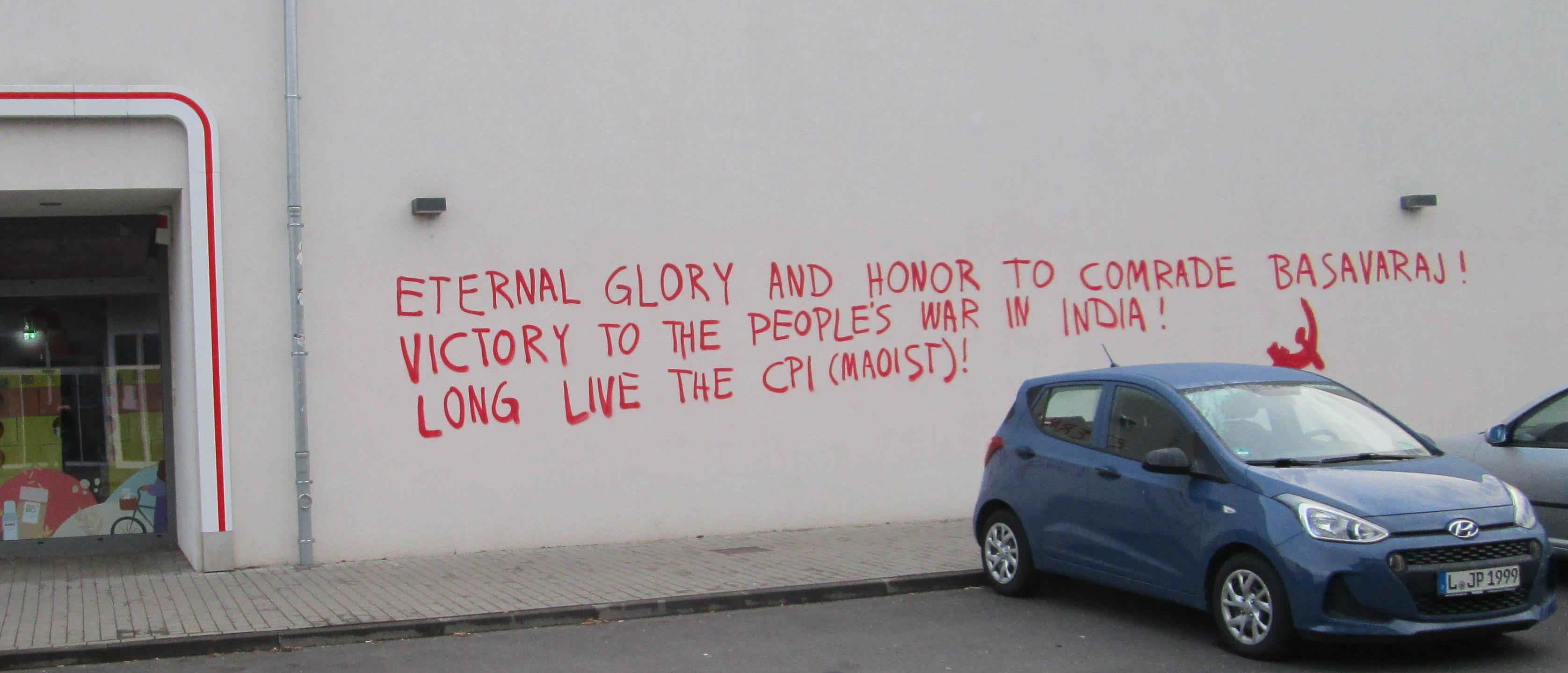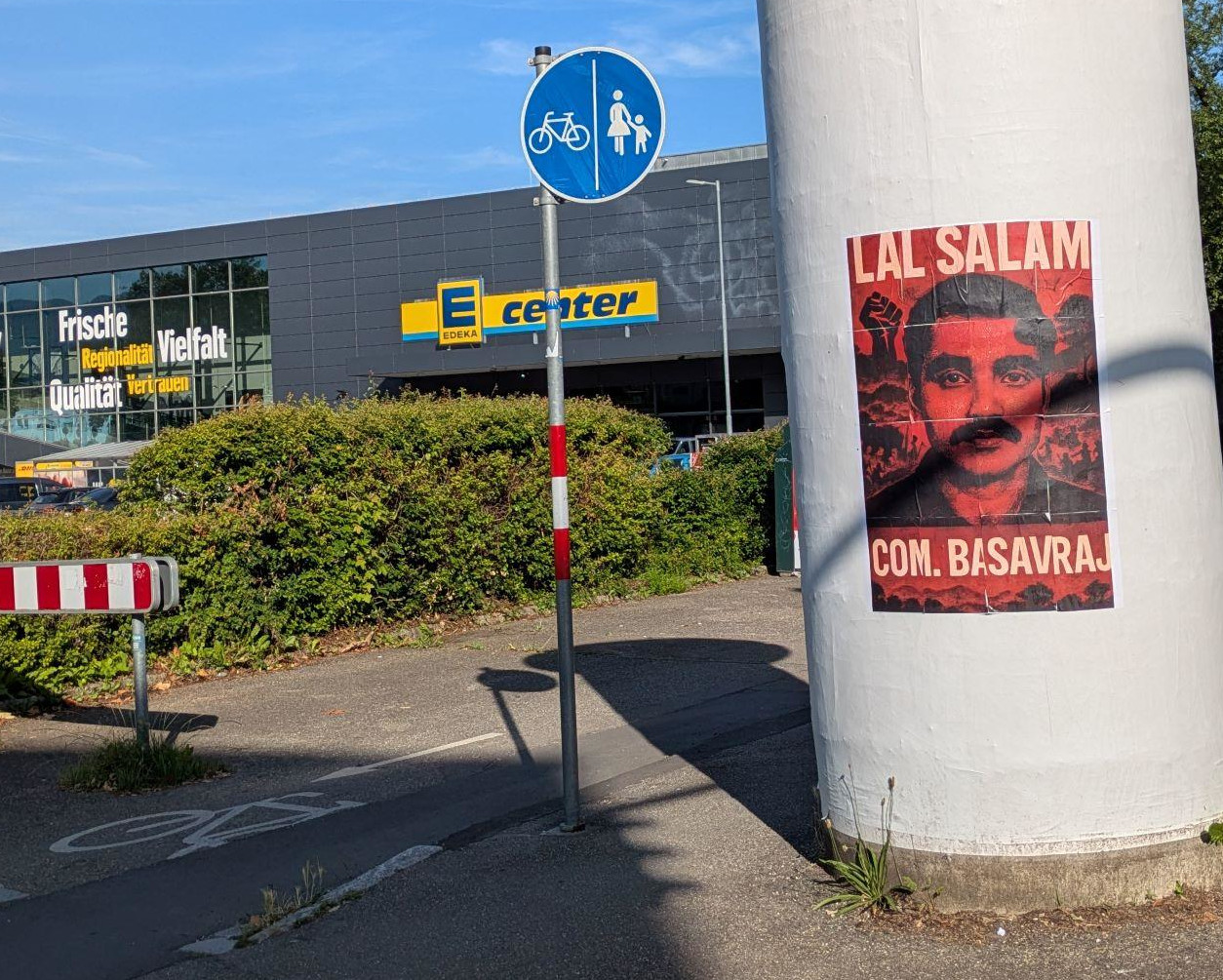 Various actions were carried out by activists of the Red League in different parts of the country. Reports reached us from Dortmund, where a mural featuring the portrait of Comrade Basavaraj and slogans was painted in the Nordstadt, and from Freiburg, where large wallpapers with the picture of the murdered General Secretary of the Communist Party of India (Maoist) were hung in the neighborhoods of Unterwiehre, Stühlinger, and Vauban. We also received reports of Dazibaos in Leipzig.