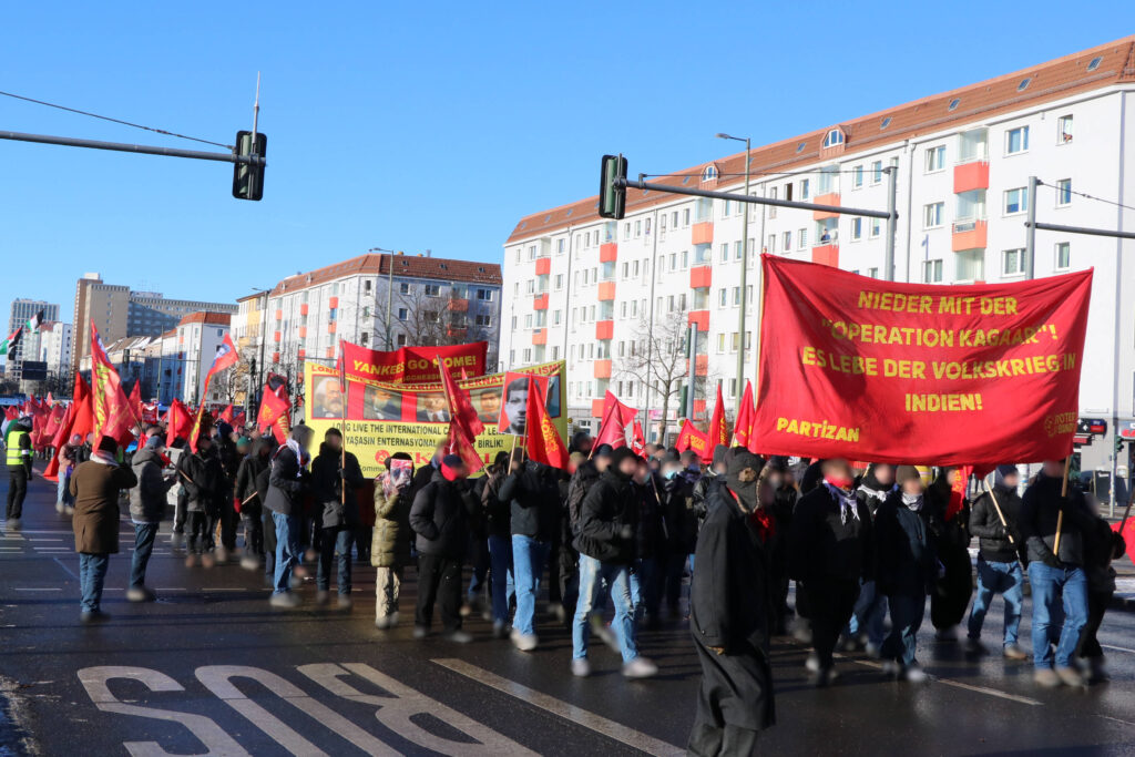 At the demonstration on January 11, together with Partizan, we clearly expressed our solidarity with the Communist Party of India (Maoist) and the People’s War it is waging, and commemorated its General Secretary, Comrade Basavaraj, who was murdered last year. As part of its campaign of encirclement and annihilation under the title “Operation Kagaar,” the Indian reaction killed over 400 people last year and attempted to completely smash the People’s War in India, among other things with the help of traitors. Together with our international comrades from Holland, Norway, Poland, Austria, and Russia, we closed ranks with the CPI (Maoist) on this day, which insists on armed struggle despite the difficult situation, and thus expressed our principled position.