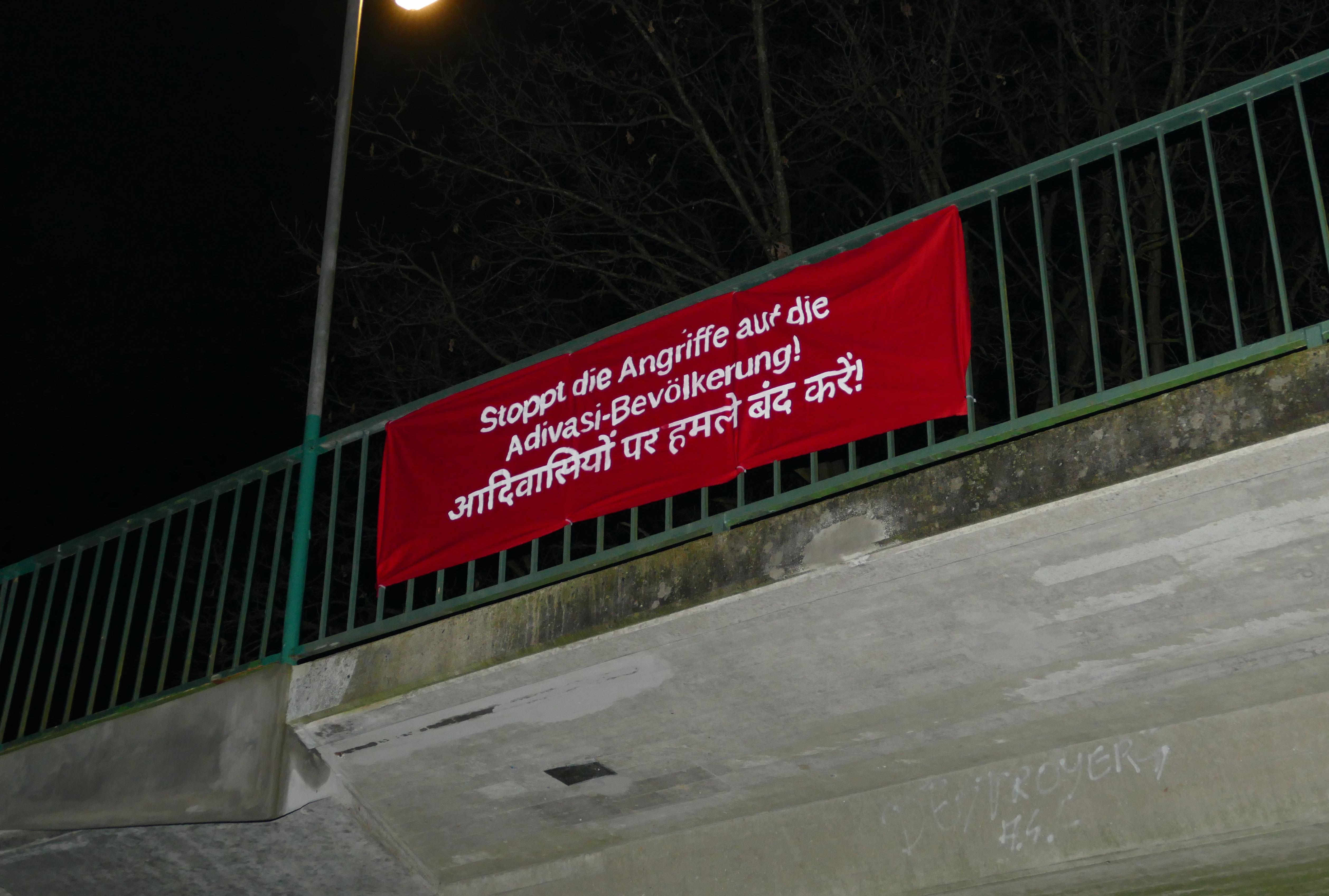 In Bremen-Blockdiek sind diese Woche Transparente entlang der Hauptstraße und an der Straßenbahnlinie aufgetaucht, die die Operation Kagaar und die damit einhergeheneden Angriffe auf die Adivasi-Bevölkerung in Indien anprangern.