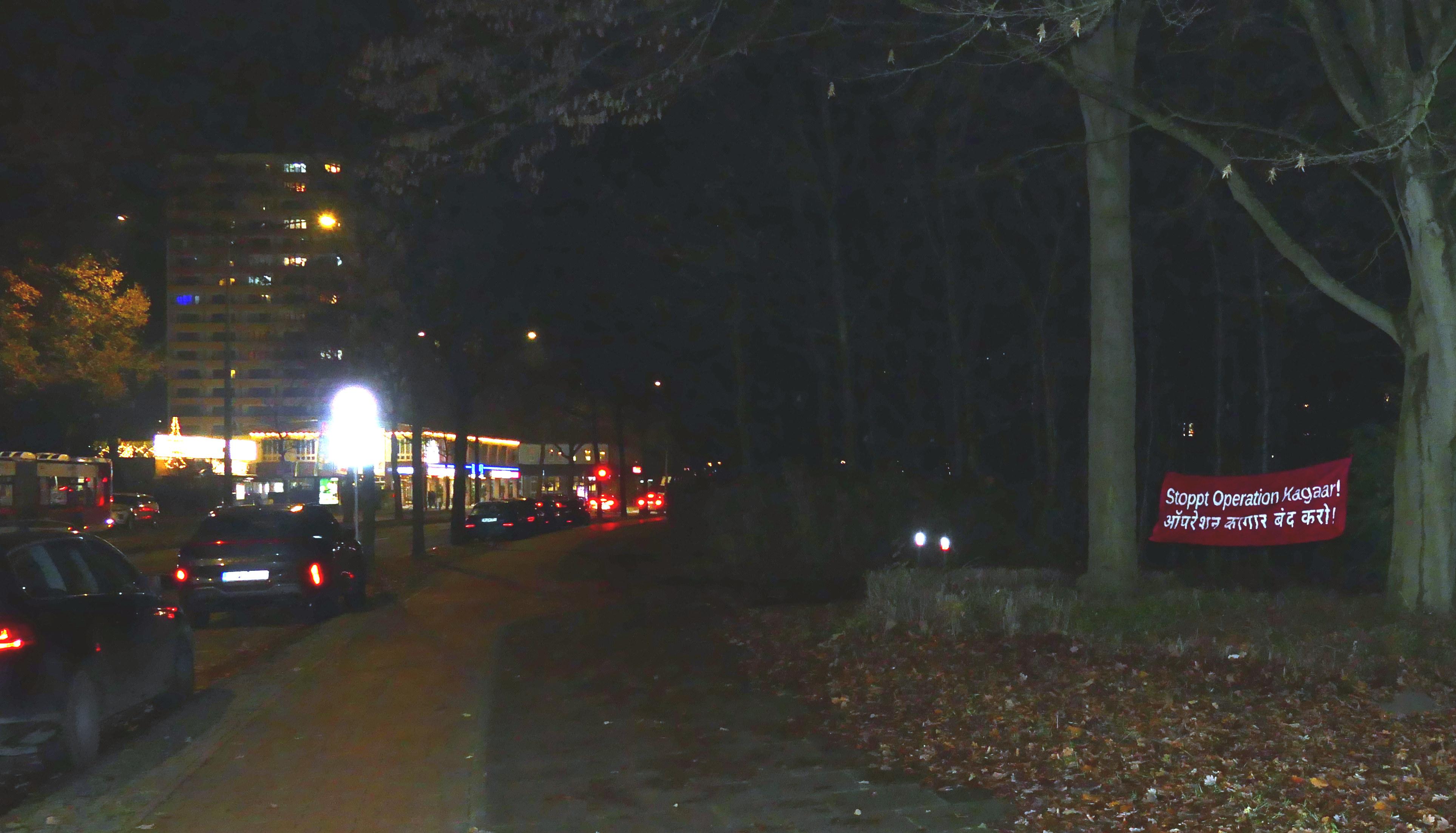 In Bremen-Blockdiek sind diese Woche Transparente entlang der Hauptstraße und an der Straßenbahnlinie aufgetaucht, die die Operation Kagaar und die damit einhergeheneden Angriffe auf die Adivasi-Bevölkerung in Indien anprangern.