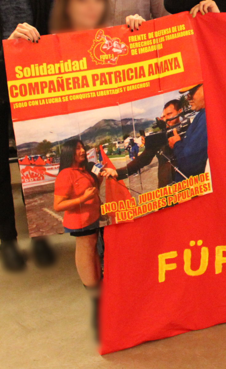 Die Genossin ist eine wichtige Gewerkschaftsführerin und Mitglied der FDDT-I (Front zur Verteidigung der Arbeiterrechte in Imbabura), die vom alten ecuadorianischen Staat mit Repressionen der Überwachung, Schikane und strafrechtlicher Verfolgung überzogen wird. In dem Rahmen der politisch-kulturellen Aktivität wurde ein Solidaritätsfoto aufgenommen, welches wir mit euch teilen.